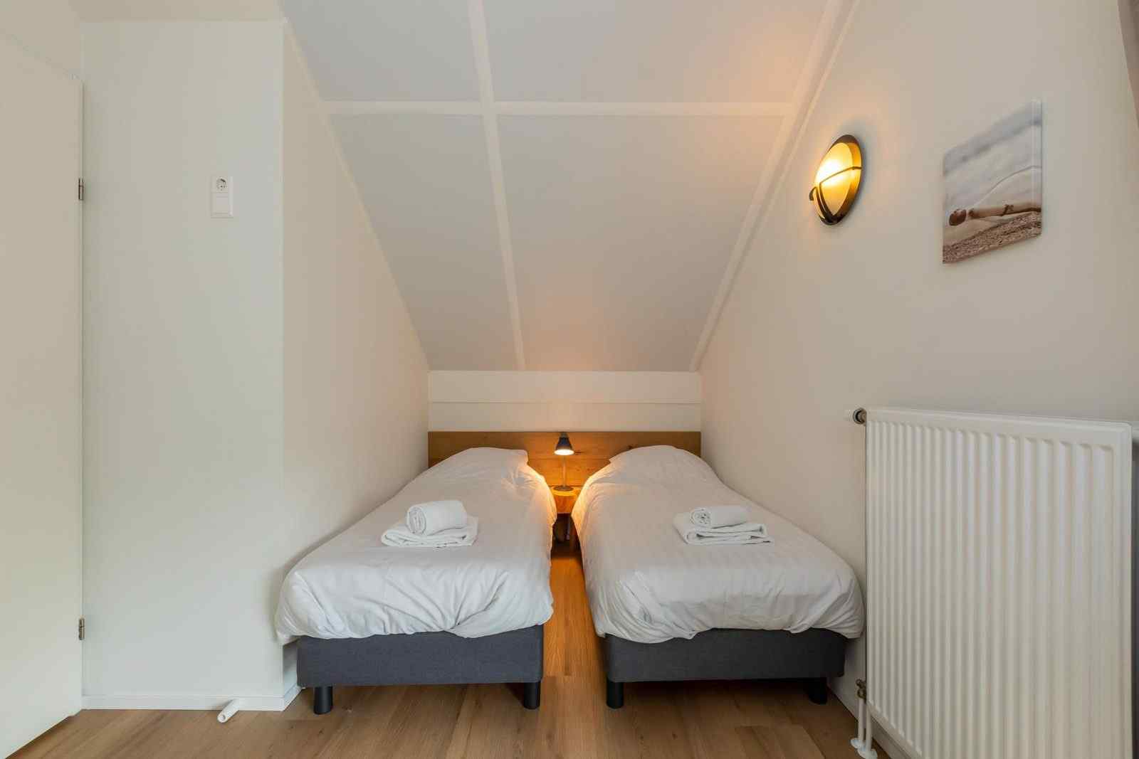Die Ferienvilla befindet sich auf einem großzügigen Grundstück. Dank der großen Glasfassaden können Sie vom gesamten Wohnbereich aus den Blick auf den grünen, eingezäunten Garten genießen. Das Wohnzimmer hat eine gemütliche Sitzecke mit Fernseher. Die Treppe nach oben führt in die Mitte des Wohnzimmers, wodurch eine gemütliche Trennung zwischen dem Wohn- und dem Essbereich entsteht. Der Esstisch ist eine Erweiterung der Küche. Die Eckküche ist u.a. mit Induktionskochfeld, Kombimikrowelle, Geschirrspüler, Kühlschrank, Filterkaffeemaschine und Wasserkocher ausgestattet. Ebenfalls im Erdgeschoss befindet sich ein Schlafzimmer mit einem Doppelbett, bestehend aus zwei Einzelmatratzen (90x200 cm) und einem angrenzenden Badezimmer mit Waschbecken und Dusche. Im ersten Stock gibt es zwei Schlafzimmer mit zwei Einzelbetten. Beide Schlafzimmer haben einen Kleiderschrank. Das Badezimmer hat ein Waschbecken und eine begehbare Dusche und es gibt eine separate Toilette. Vom Wohnzimmer aus gelangen Sie direkt auf die Terrasse, wo Sie absolute Privatsphäre genießen können. Gegenüber dem Ferienhaus können zwei Autos geparkt werden.