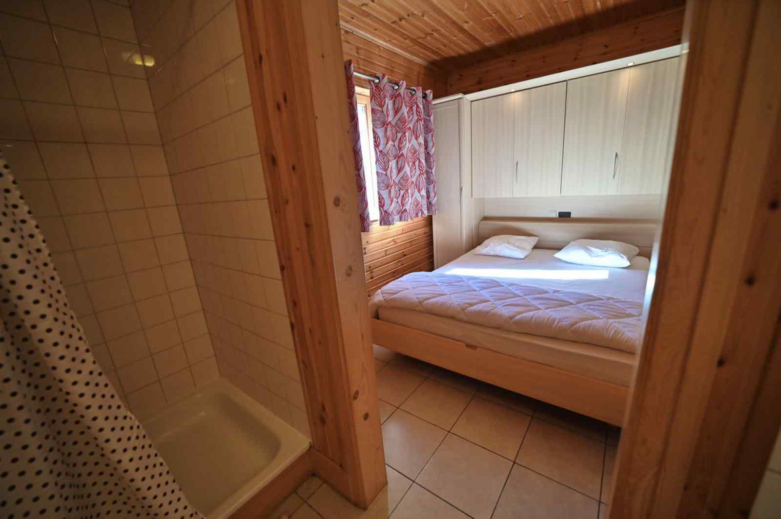 Ein Schlafzimmer mit einem Doppelbett und ein Schlafzimmer mit zwei Etagenbetten. Beide Schlafzimmer haben eine eigene Dusche, Waschbecken und Toilette.