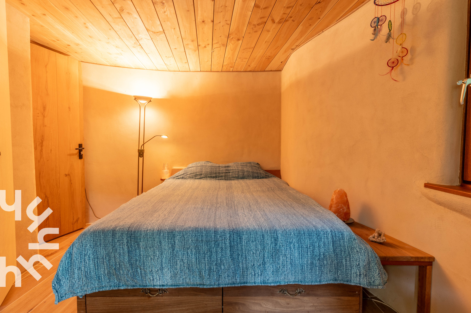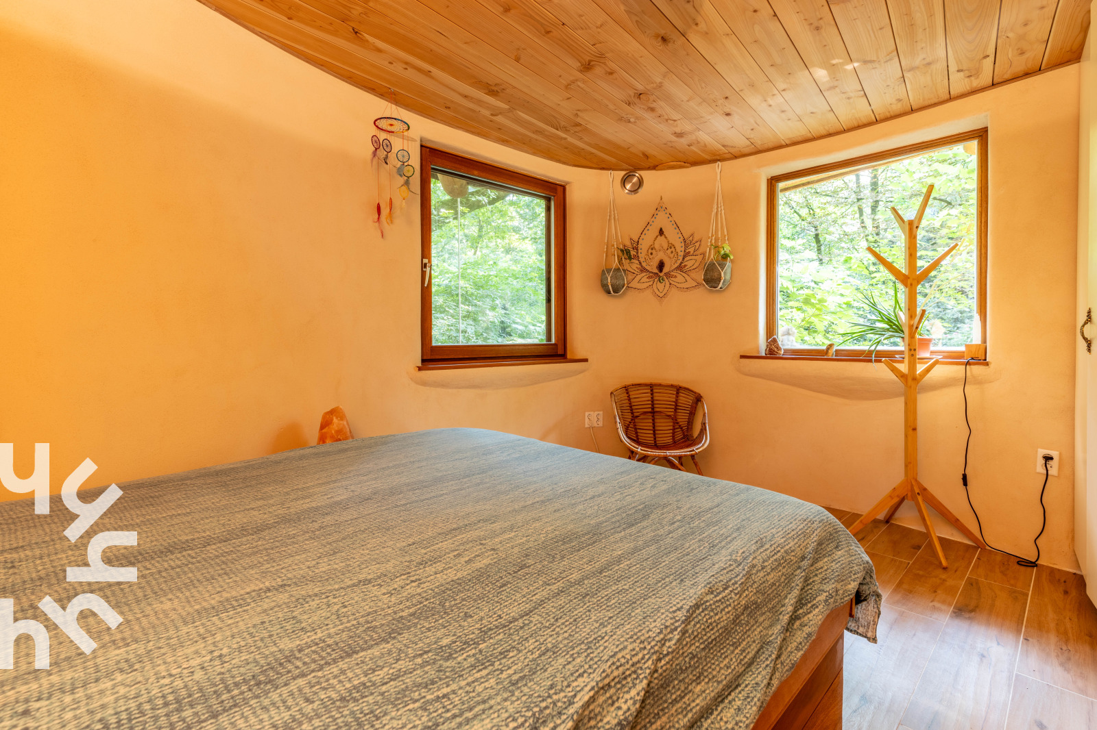 Das Haus ist mit ökologischen Materialien eingerichtet und es gibt viele organische runde Formen. Das Wohnzimmer ist geräumig, hat einen Holzofen und bequeme Möbel aus Holz und Naturstein. Die offene Küche ist mit einem Induktionskochfeld, Geschirrspüler, Kühlschrank und Geschirr ausgestattet. Grundlegende Kochzutaten, Gewürze, Kaffee und Tee sind ebenfalls vorhanden. WiFi ist im ganzen Haus verfügbar. Es gibt zwei Schlafzimmer, das erste mit einem Doppelbett und das zweite mit einem Queen-Size-Bett (140x200 cm) und einem Etagenbett darüber. Das Bettzeug ist allergiefrei. Im Badezimmer gibt es eine Toilette, Waschbecken, Waschmaschine, Regendusche und eine Natursteinbadewanne. Aufgrund einer Klärgrube sind nur ökologische Seife und Kosmetika erlaubt. Seife, Shampoo und Duschgel sind vorhanden. Hühner, Enten und zwei Katzen tummeln sich im Haus und werden mit Futter und Getränken versorgt. Die Tiere sind zahm und die Katzen kommen nicht ins Haus. Sie können auf dem Gelände parken.