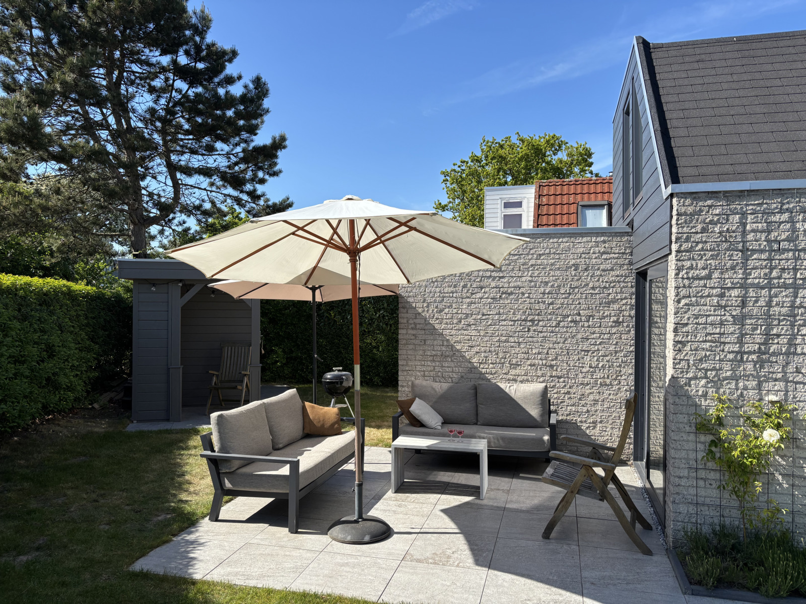 Draußen gibt es einen großen Garten mit einer Loungeset, einem Picknicktisch und einem Grill. Es gibt einen Parkplatz für ein Auto.