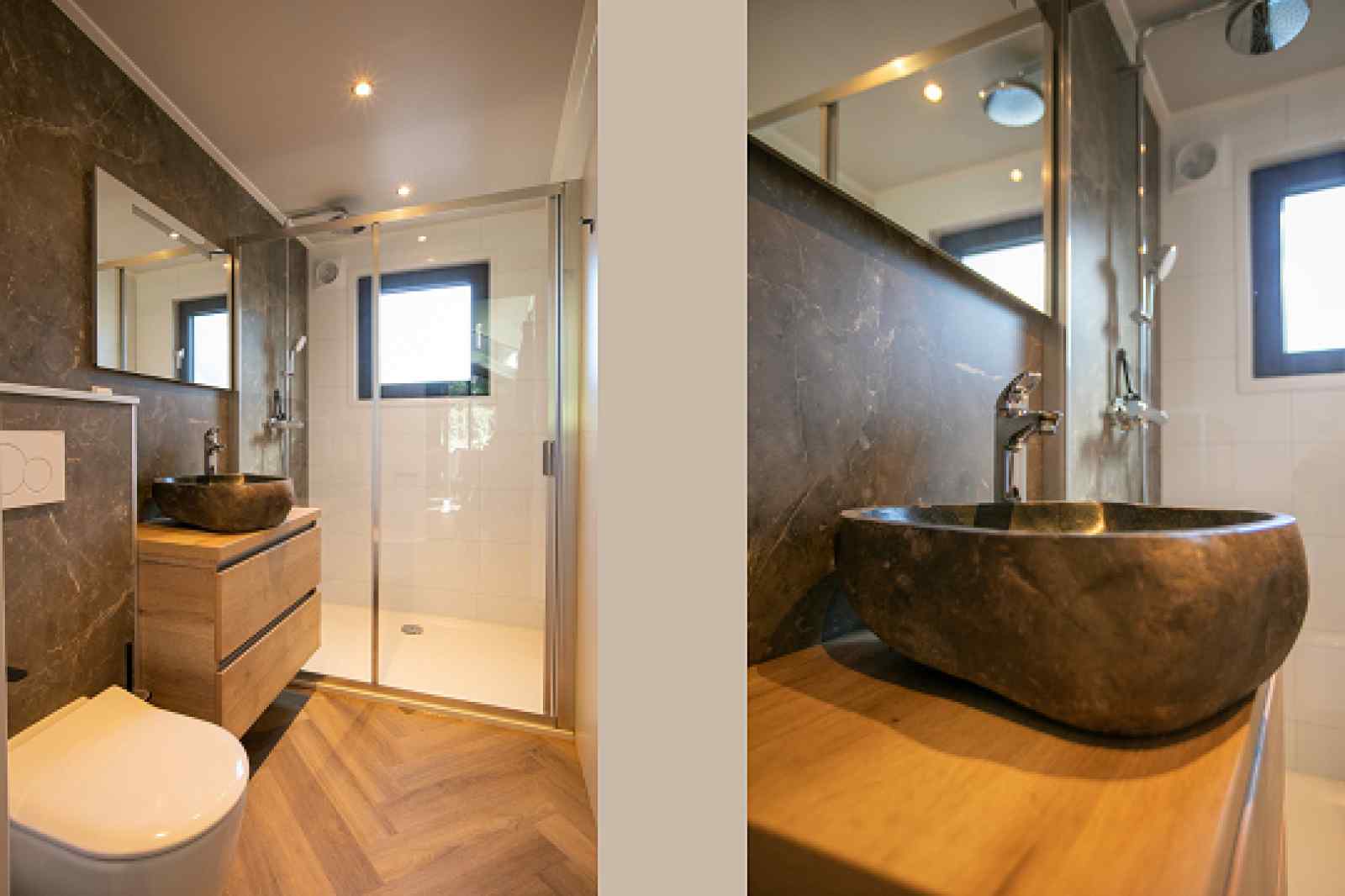 Diese moderne Lodge ist mit allem Luxus und Komfort ausgestattet. Das Wohnzimmer ist schön eingerichtet und verfügt über einen Smart-TV, ein Ecksofa und einen geräumigen Esstisch. Die offene Küche verfügt über ein komplettes Inventar mit Nespresso-Kaffeemaschine, Wasserkocher, Kühlschrank mit Gefrierfach, Geschirrspüler, Kombi-Mikrowelle und Kochfeld. Das Haus hat drei Schlafzimmer, eines mit einem Doppelbett und zwei Schlafzimmer mit zwei Einzelbetten. Es gibt eine Waschmaschine und einen Trockner im Haus. Das Badezimmer hat eine Dusche, Toilette und Waschbecken. Das Haus hat eine Fußbodenheizung, die in den Sommermonaten auch eine Kühlfunktion hat. Der Garten verfügt über eine große Terrasse und mehrere Plätze, an denen Sie Ihre wohlverdiente Entspannung an der frischen Luft genießen können. Suchen Sie Abkühlung in Ihrem exklusiven privaten Tauchbecken oder kühlen Sie sich unter der Außendusche ab. Es gibt auch die Möglichkeit, Ihr E-Bike draußen aufzuladen; der Garten mit Pool kann mit einem Tor abgeschlossen werden.