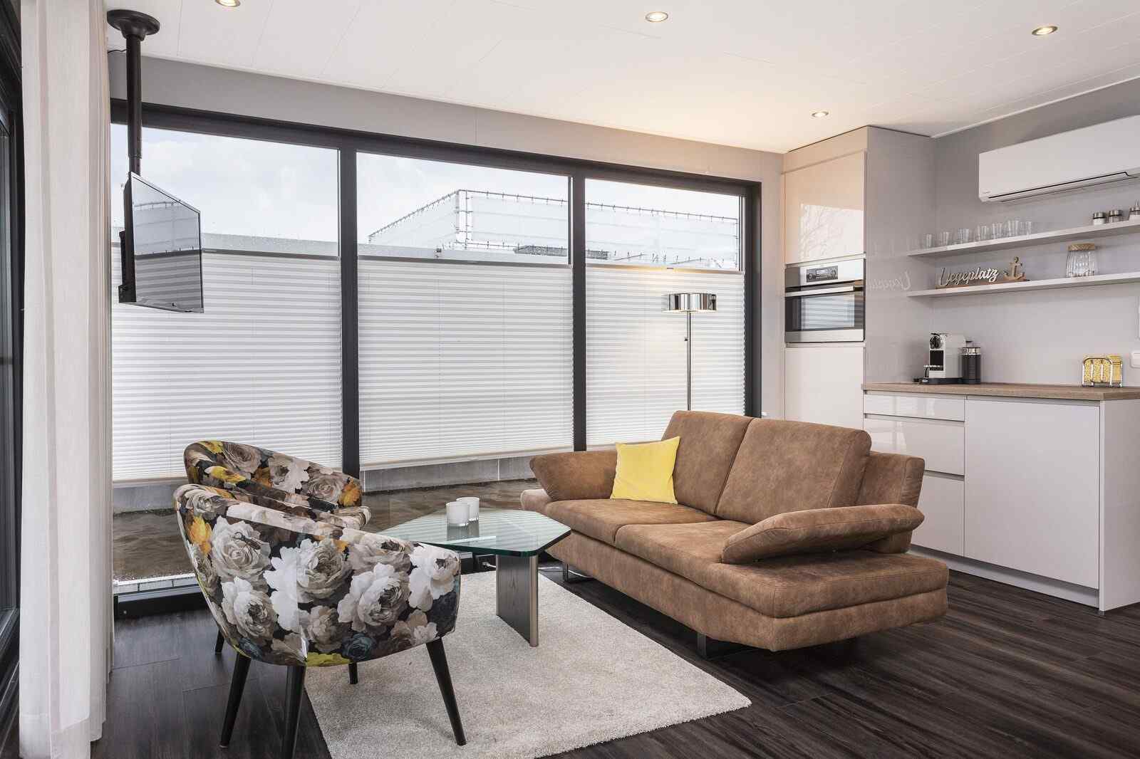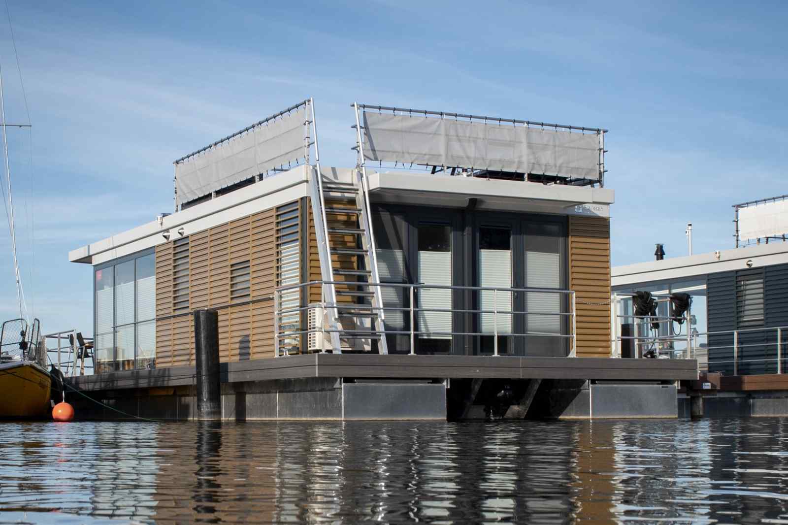 Auch im Inneren des Bootes können Sie einen schönen Blick über das Wasser genießen. Das Hausboot verfügt über ein schönes Wohnzimmer mit Essbereich und eine gemütliche Sitzecke mit Smart-TV. Der Fernseher verfügt nicht über ein Programmpaket, Sie müssen also Ihren eigenen Google Chromecast mitbringen.Die offene Küche ist mit Kombi-Mikrowelle, Geschirrspüler, Kühlschrank mit Gefrierfach, Vier-Flammen-Herd, Kaffeemaschine (Filter und Nespresso), Wasserkocher und Toaster ausgestattet. Beide Schlafzimmer verfügen über ein Doppelbett (160x200), Nachttische und Verdunkelungsvorhänge. Für die kleinsten Gäste gibt es ein zusammenklappbares Babybett (60x120cm) und einen Hochstuhl. Das Badezimmer hat eine Dusche, WC und Badmöbel mit Spiegel. Den Panoramablick können Sie auf der Dachterrasse und im Garten des Hausboots genießen. Im Garten gibt es eine Gartengarnitur für vier Personen und einen Grill. Über die Treppe erreichen Sie die sonnige Dachterrasse mit zwei Sonnenliegen. Ein Auto kann hinter der Schranke geparkt werden.